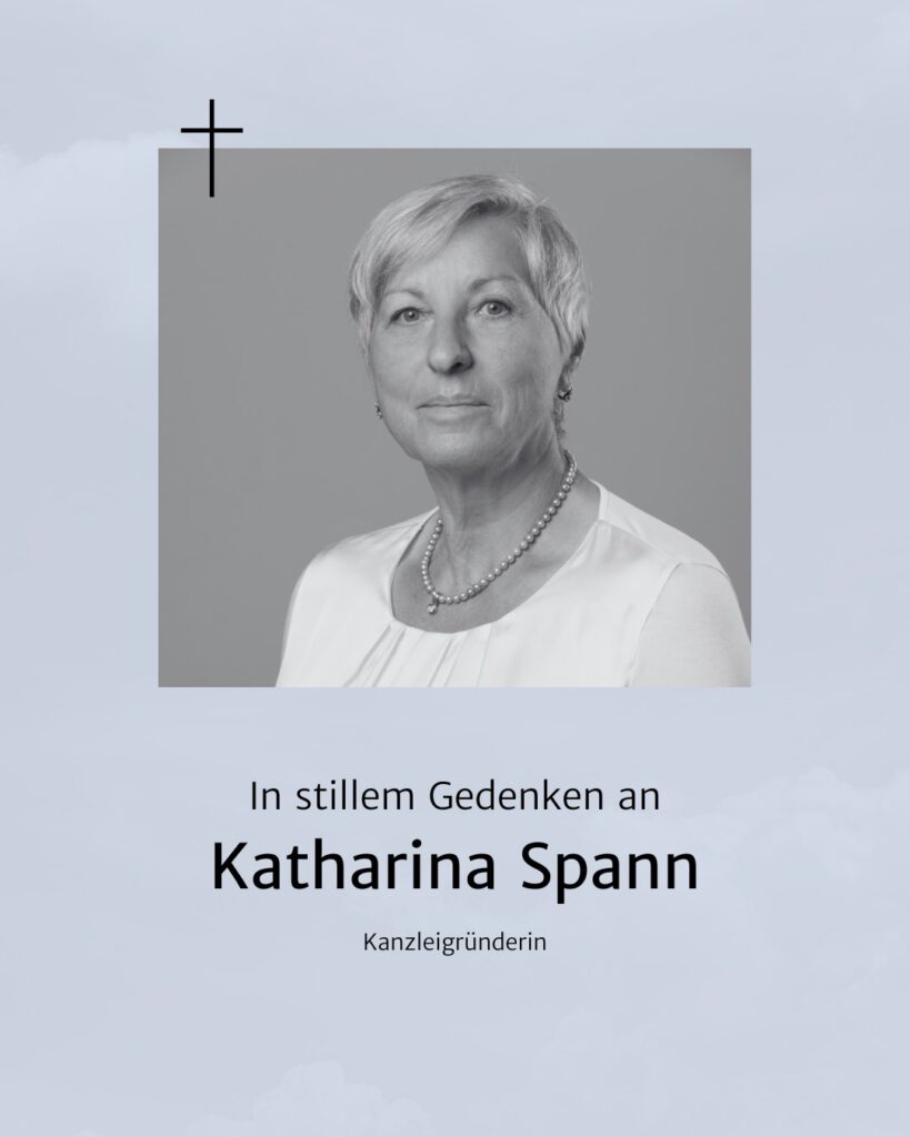 Mit großer Bestürzung nehmen wir Abschied von Katharina Spann, unserer Kanzleigründerin, langjährigen Wegbegleiterin und geschätzten Chefin. Mit ihrer außergewöhnlichen